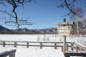 長く見渡せる湿原の木道の上を歩き、途中で男体山が見える展望スポットがあるので楽しく歩けるスノーシューの有名な場所となっています!